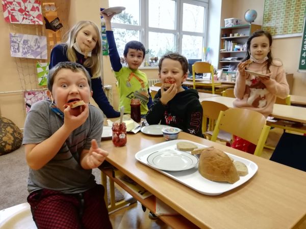 Výpadek elektrického proudu nám zpestřil den - školní jídelna byla mimo provoz, a tak jsme poobědvali čerstvý, skoro ještě teplý, chleba, který nám přivezl p. ředitel z pekárny. Sami jsme si jej namazali máslem a marmeládou. A když proud zapli, uvařili jsme si dezert - pudink. Vanilkový se nám trošku připálil... (Vendův výraz mluví za vše...) Byl to parádní zážitek!