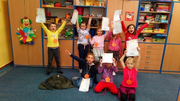V družince také sportujeme, pořádali jsme malé olympijské hry. Vyzkoušeli jsme pět disciplín, vyprávěli si o olympijských hrách a všichni získali diplom a medaili. Jsme opravdu šikovní a zdatní sportovci!