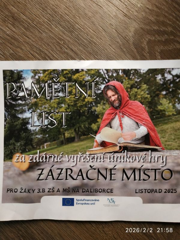 V rámci projektu MAP jsme se zúčastnili originální únikové hry s názvem „Zázračné místo“. Děti v týmech řešily rozmanité úkoly rozvíjející čtenářskou gramotnost, týmovou spolupráci a logické myšlení. Cílem hry bylo objevovat knihy a jejich obsah netradiční a zábavnou formou...