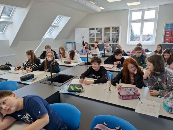 Od nového školního roku využíváme novou učebnu fyziky. V šesté třídě se seznamujeme s měřením základních fyzikálních veličin. Měřili jsme objem nepravidelného tělesa pomocí odměrného válce.