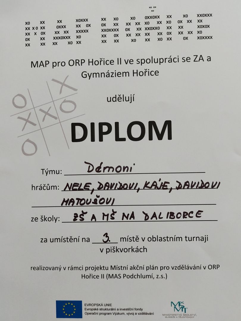 Dne 16. 9. 2022 se vybraní žáci 2. stupně naší školy zúčastnili Turnaje v piškvorkách, který pořádala MAS Podchlumí. Setkala se zde 5členná družstva ze šesti základních škol - ZŠ Komenského, ZŠ Na Habru, ZŠ Na Daliborce, ZŠ Ostroměř, ZŠ Chomutice a Gymnázia Hořice. Naši Démoni získali krásné 3. místo a patří jim velká gratulace a uznání. Rovněž děkujeme za skvělou organizaci a těšíme se na další podobná setkání.