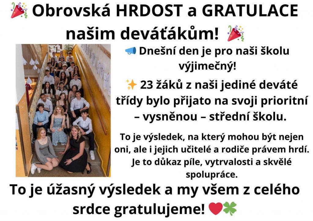 Milí deváťáci, děkujeme za společně strávený čas, za úsměvy, otevřenost, i za to, jací jste byli – jedineční, sví a úžasní. Bylo nám ctí vás doprovázet na vaší cestě základní školou.