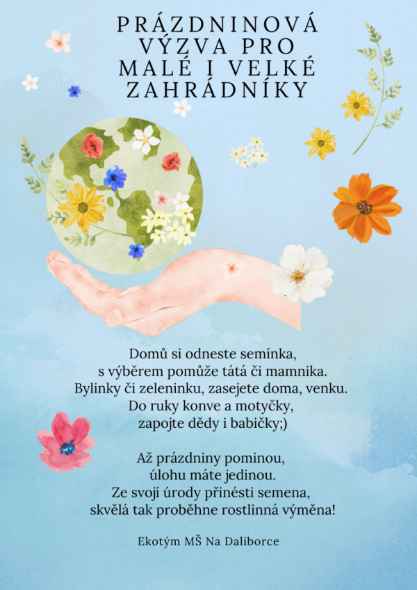 Milí zahradníci, pokud se vám přes prázdniny podaří vypěstovat zeleninku, květiny či bylinky (a to nejen z našich "školkových semínek"), prosíme o jejich sběr a následné sdílení v naší SEMÍNKOVNĚ ve školce, případně pak na akci Zažít Hořice jinak, které se stejně jako loni jako školka zúčastníme.