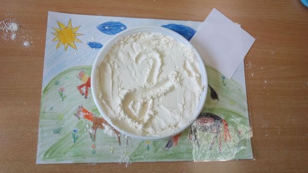 V hodině českého jazyka jsme četli o makovém mužíčkovi, který se učil psát písmenka do mouky. Využili jsme tuto aktivitu k opakování velkých psacích písmen. Super zážitek a relaxace.