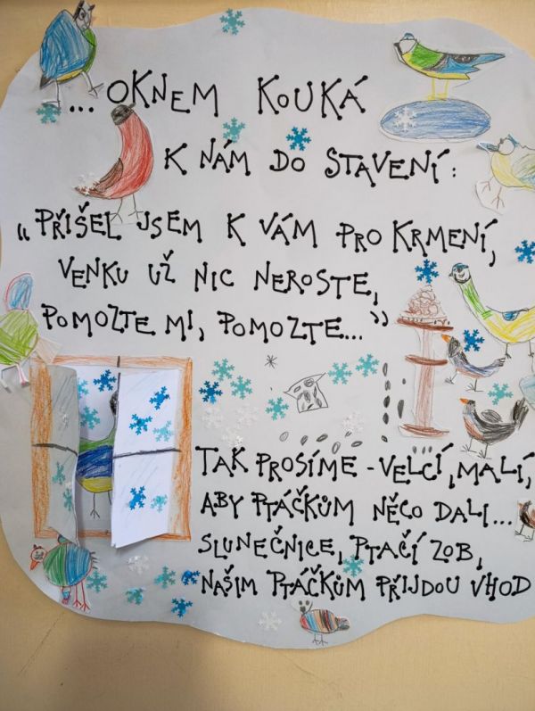 Milí rodiče, nastalo nám zimní období a my bychom opět s dětmi rády nasypaly ptáčkům do krmítka nějaké zobání. Prosíme, kdo máte možnost, můžete donést - různá semena např. slunečnicová na kterých si smlsnou hlavně sýkorky. Vrabci nebo hrdličky uvítají na krmítku také obilná zrna jako oves, proso a pšenici. Zakoupit můžete také již namíchané směsi krmení pro přezimující ptáky označované jako krmivo pro venkovní ptactvo či zimní směs. Lojové kouličky v plastové síťce se neosvědčily (jsou pro ptáčky nebezpečné).