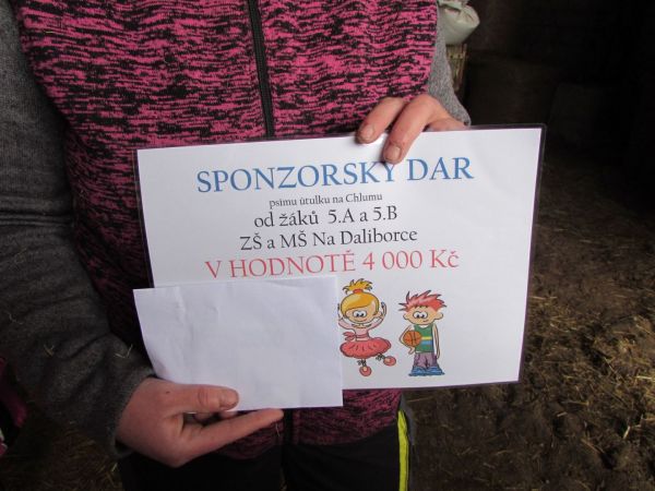 Slunce ráno sice nevyšlo, ale vyšli páťáci... a to směrem k psímu útulku na Chlumu, protože před časem dali slib, který chtěli právě v tento den splnit. Díky projektu Abeceda peněz jsme získali určitý finanční obnos, ze kterého se děti rozhodly věnovat psímu útulku SPONZORSKÝ DAR ve výši 4 000 Kč na zakoupení nové psí boudy. A za odměnu nám majitel umožnil, abychom si ji barevně vyzdobili a každé dítě se na ni viditelně podepsalo.