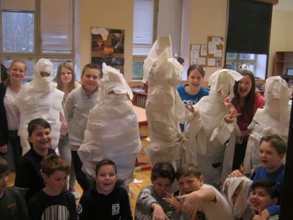 Žáci v 6. ročníku dnes pojali hodinu dějepisu zase tak trochu jinak a ve skupinách nabalzamovali své kamarády. Nutno podotknout, že některé z mumií se až nápadně podobaly těm, o nichž jsme si povídali v souvislosti s prezidentskými volbami…????