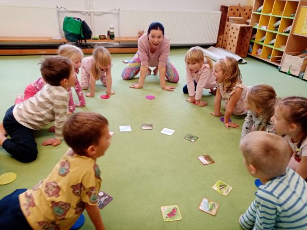 Pozice psa, kočky, netopýra, zajíce, ježka, plameňáka, krokodýla a spoustu dalších zvířátek - to jsou jogové pozice, které již krásně zvládáme! Také se klepeme jako kostlivci nebo hrajeme na mrkev a puding. Namasírujeme kamaráda, meditujeme a smějeme se...to je joga s Ivetkou Hanušovou, která nás ve školce pravidelně navštěvuje.