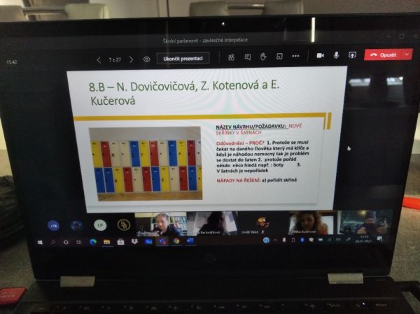 Poslední měsíc jsme se poctivě připravovali na závěrečné interpelace na vedení školy. Zástupci ŠP kontaktovali na třídnických hodinách svoje spolužáky i třídní učitele a poptávali se u nich, co by rádi změnili nebo nově zavedli. Nápady jsme si poctivě připravili na online distančních schůzkách, abychom se dnes v aplikaci MS TEAMS mohli předvést. Dorazili ředitel školy J. Sezima i paní zástupkyně L. Štěpánková. Tradičně nejvíce vášní vyvolala snaha povolit mobily o přestávkách alespoň po dobu pokračující vážné epidem. situace. Na definitivní rozhodnutí nejen k této palčivé otázce, ale třeba i automatům na jídlo či relaxačním zonam na chodbách si ještě budeme muset počkat. Díky moc za Váš čas, milí členové školního parlamentu! S Lenkou si toho moc vážíme.