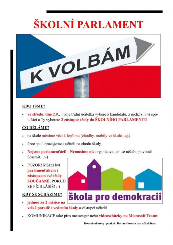 Letošní rok jsme po minulých zkušenostech pojali zase trochu jinak, abychom ještě více uspokojili hlad a zájmy našich žáků. Rozdělili jsme tedy naši dosavadní "činnost" na dvě samostatné organizace. ŠKOLNÍ (ŽÁKOVSKÝ) PARLAMENT bude fungovat jako poradní sbor. který může své nápady a připomínky přednášet vedení školy. Třídní učitelka vybere několik kandidátů, z nichž už zítra děti ve své třídě zvolí 2 zástupce do ŠP. Ti se pak budou scházet 4x ročně na zasedáních s koordinátory a ředitelem školy. Schůzky budou moci probíhat i tzv. na dálku, prostřednictvím aplikace Microsoft Teams. Tyto děti se jinak už do činnosti pro školu zapojovat nemusí, neboť z toho důvodu zřizujeme paralelní zájmový kroužek Parlamenťáček, jehož náplň v zásadě zůstává stejná jako v loňském roce. Děti mohou současně působit v obou organizacích! …