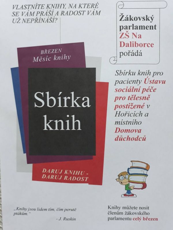 Náš školní parlament pořádá další ze svých akcí. Tentokrát se jedná o Sbírku knih pro pacienty Ústavu sociální péče pro tělesně postižené v Hořicích a místního Domova pro seniory. Knihy, kterými byste rádi udělali radost někomu jinému a jež se Vám doma jen tak pro nic za nic válí, můžete nosit do školy - sborovny. Děti je pak mohou předat zástupcům ŠP ve svých třídách. Akce končí posledním březnovým dnem. Děkujeme :-)