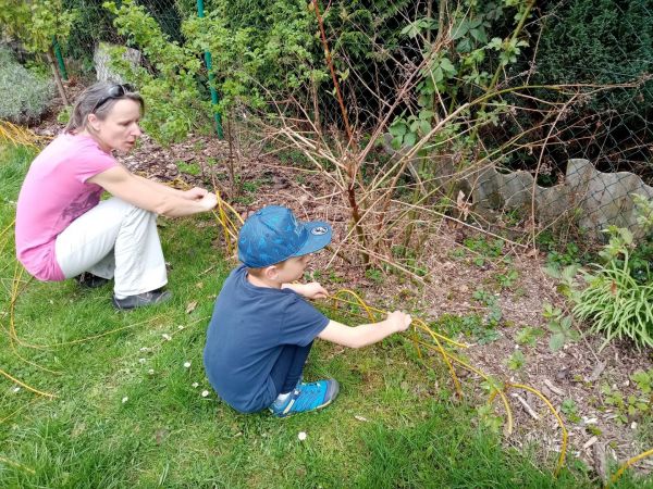 Společnými silami jsme se pustily do přípravy záhonků, však už je nejvyšší čas;-) Plejeme, proplétáme vrbové proutí, spolupracujeme s panem truhlářem - dědečkem Rozárky:-) Práce nám jde pěkně od ruky, jsme to ale pracovité dětičky:-)