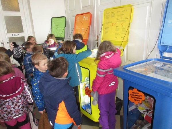 Výstava na radnici na téma třídění odpadů a recyklace...velice zajímavé a poučné...děti si znovu připomněly, co do jednotlivých kontejnerů patří x nepatří a zíraly, co vše je možné vyrobit recyklováním papíru, skla, kovů a plastů...na závěr gaučík v kontejneru (ten měl úspěch největší:-)))