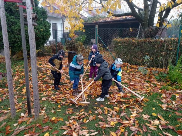 Na zahrádce si umíme nejen hrát, víme, že se o ni musíme i starat. Chytneme koště, hrábě, kolečko a práce nám jde od ruky.