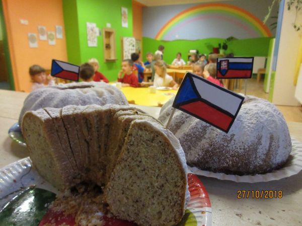 Na oslavu 100 let republiky Československé jsme se připravovali celý týden...seznámili jsme se s českými státními symboly, povídali si o naší historii, vytvořili si českou vlajku a znak, zkoumali náš národní strom lípu, poslouchali českou státní hymnu, vystrojili se do národních barev, , ochutnali vynikající česko-slovenskou bábovku a společně s panem ředitelem zasadili na naší zahradě LÍPU SVOBODY. Ke kořenům jsme zahrabali vzkaz pro příští generace...