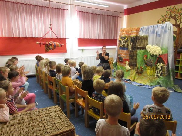 Opět jsme ve školce přivítali Dagmar Čemusovou a její divadélko...dnes si sebou přivezla celé hospodářství...Společně jsme si zazpívali, protáhli se a také se zaposlouchali do vážné hudby...