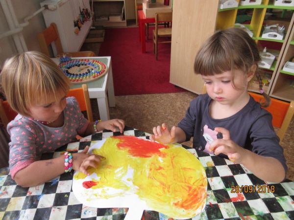 Zářím nás provázela jablíčka...výprava za jablíčkem nás dovedla na Gothard, kde jsme našli spoustu jabloní s výbornými jablky...jablíčka jsme kutáleli, zpívali si o nich, četli si pohádku, kreslili ho, malovali, ochutnávali, sami jsme si připravili křížaly a na závěr i jablíčka v županu...mňam!