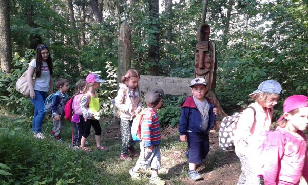 Velká pěší výprava...z kopce do kopce...cestou necestou...popředu i pozpátku...stoupáme nad Hořice...to je výhled!...Masarykova věž samostatnosti na obzoru...kaplička...lesní školka "Lišákovo doupě" - děti, ovečky, houpajda, zvonkohra, milé přijetí, co víc si přát...a zpátky je to z kopceeee...pár přírodních úkolů...sojka si nás stráží...sláva nazdar výletu, nezmokli jsme, už jsme tu!