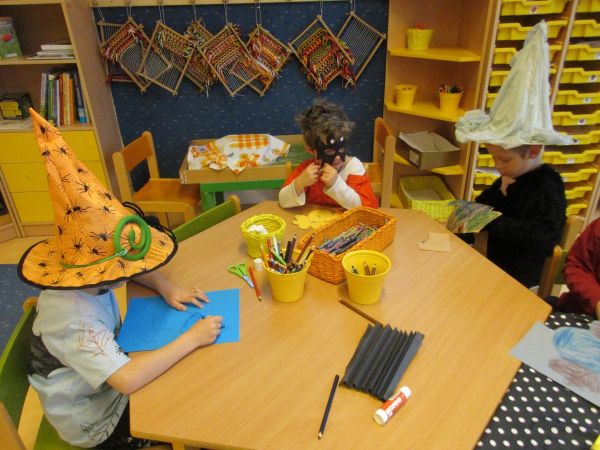 Celý týden jsme se připravovali na konec dubna, kdy se děti sešly v maskách čarodějnic a čarodějů.Děti si vyráběly čarodějnice a čaroděje, pavouky, kocoury, předškoláci si rozvíjeli grafomotorické dovednosti kresbou pavučiny. Po svačině jsme si připravili elixír se zaříkáváním. Pak přišel na řadu tanec s koštětem, chytání pakouků, rozmotávání hadů, podlézání koštěte, čarodějnická honička. Celé dopoledne jsme ukončili veselým pokřikem: "Čarodějnický rej - a nám bude večer hej!"