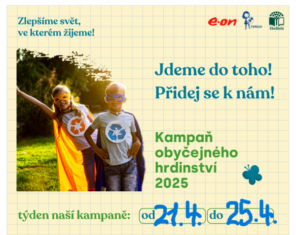 Od 21. 4. do 25. 4. naše škola zahájila Kampaň obyčejného hrdinství, která nás motivuje k udržitelnějšímu životnímu stylu. Tento týden plníme různé ekologické výzvy, které zaznamenáváme do osobních deníčků hrdinů. Každý náš malý krok pomáhá planetě – ať už jde o omezení odpadu, úsporu energie nebo šetrnější dopravu. Každý si vybere, co je mu blízké.