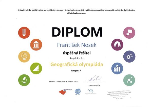 Velká gratulace patří našemu žáku 6.B, Františku Noskovi za úspěšné řešení krajského kola geografické olympiády v Hradci Králové. Děkujeme za reprezentaci naší školy a přejeme spoustu dalších úspěchů!