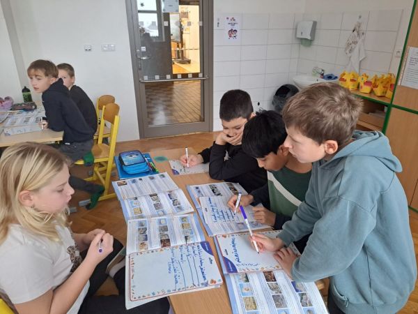 Vrstevnické učení v rámci přírodovědy na téma horniny a nerosty. Žáci se navzájem učí a vzájemně si předávají a rozvíjejí své znalosti i dovednosti. Diskutují, sdílejí si zkušenosti, všichni jsou aktivně zapojeni, navzájem si pomáhají. Aktivní práce týmu a fajn nálada je při učení důležitá.