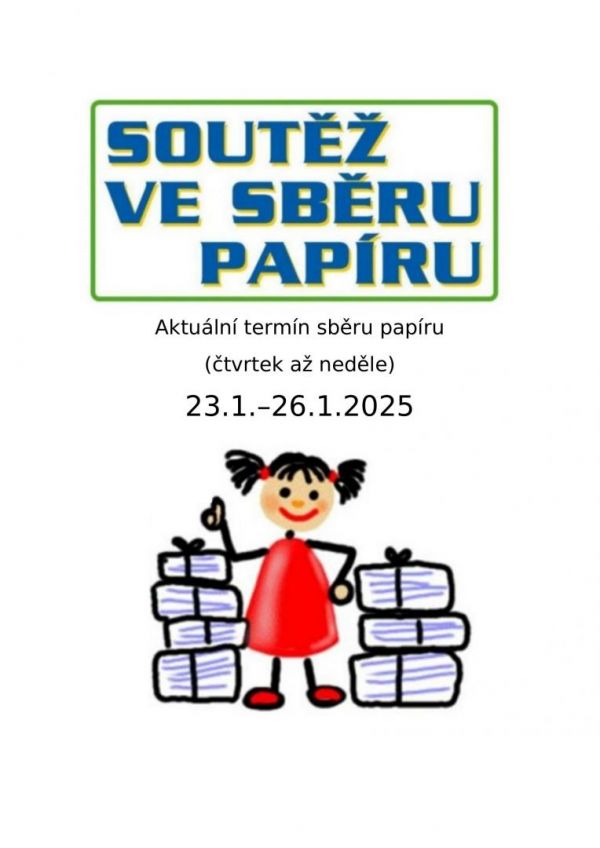 Tento týden opět pokračujeme ve sběru papíru. Kontejner bude přistaven již ve čtvrtek 23.1. a bude Vám k dispozici po celý víkend. Odvezen bude v časných ranních hodinách z neděle na pondělí.