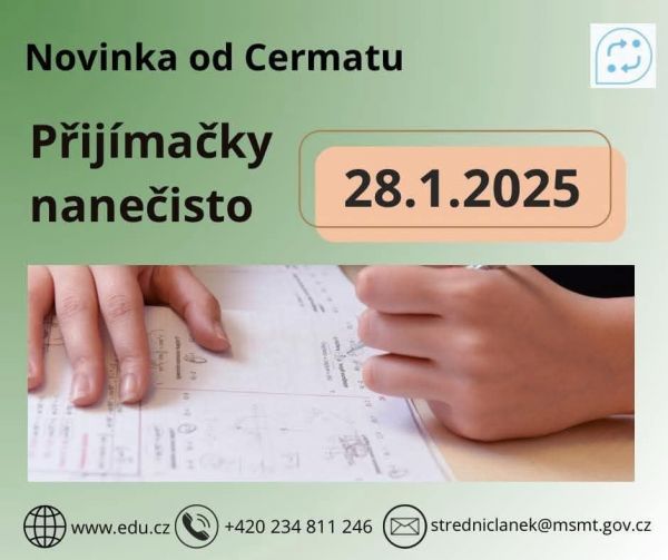 Žáci devátého ročníku budou mít tuto možnost zdarma!!! Více info na https://prijimacky.cermat.cz/menu/prijimacky-nanecisto