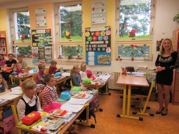 Dne 4.9. přivítala nové prvňáčky třídní paní učitelka Kristýna Moravcová spolu s ředitelem Janem Sezimou a starostou města Alešem Svobodou.